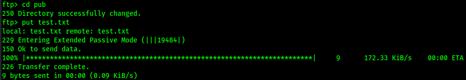 Now that I knew for sure that I could upload a file, I put the test file I created in the pub directory in case I could check if I could access it later. I navigated inside the directory using cd pub and the uploaded the file using put test.txt.