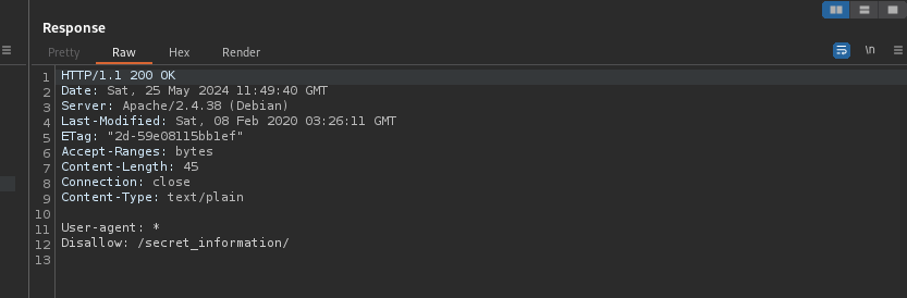 I sent the request and was returned with the real robots.txt, which mentioned a directory named “/secret_information/”.
