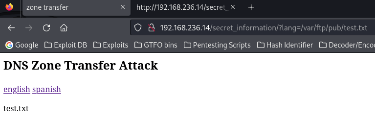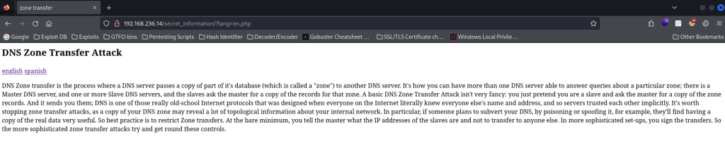 I went to this newly discovered portion of the website and noticed that it mentioned DNS Zone transfer attacks. I noticed that the “english” and “spanish” links referenced a php parameter in the URL.