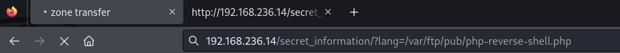 Since I uploaded a file in FTP’s “pub” directory earlier, I decided to try to find this and see if I could read it from the website and see where it was located. After some trial and error, I found that the file I uploaded was reachable from the local file inclusion vulnerability that I had found at “/secret_infomation/?lang=/var/ftp/pub/test.txt”.