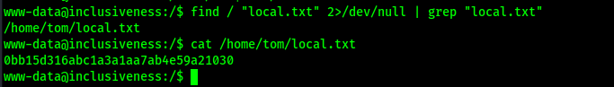 Now that I was logged in, I could find the first flag on the machine using the command find / "local.txt" 2>/dev/null | grep "local.txt". This revealed that the flag was in tom’s home directory.