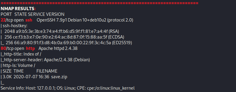 The NMAP scan reveals port 22 (SSH) and port 80 (HTTP) are open. Since I do not have currently have credentials. I went to the website and noticed that it is a listing, with only save.zip, which was originally revealed by the NMAP scan.