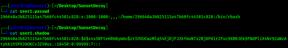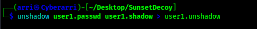 Using these files, I created the new file that can be used to try to get the password with the command unshadow user1.passwd user1.shadow > user1.unshadow.