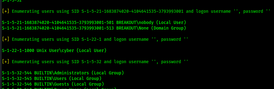 Since there is Samba (ports 139/445), I decided to try running enum4linux to see if there is any shares or users that can be enumerated using the command enum4linux -a $IP. This reveals a user named “cyber”.