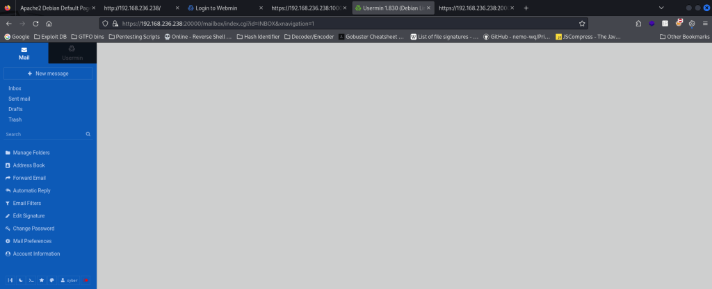 Using the user “cyber” and the text I decoded earlier, I tried to log into one of the login forms using that username and (possible) password combo. I was not able to log in to the website on port 10000, but I could login on port 20000 using that combo.