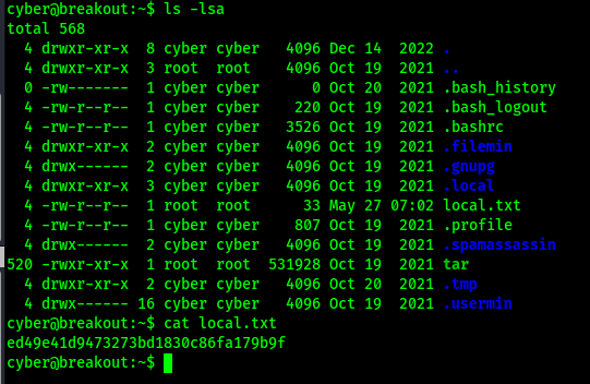 I looked at the current directory using ls -lsa and found my first flag (note: this can also be found using find / "local.txt" 2>/dev/null | grep "local.txt").
