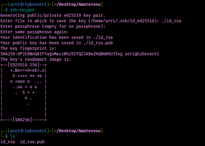 Now that I know this, I can try to upload files to this directory. I created an id_rsa key for this machine using ssh-keygen. I specified that I wanted it to be saved in the current directory under name the name “id_rsa” by entering ./id_rsa when prompted. I also specified no passphrase. Once this was done, I ensured that the files were in my current directory.