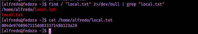 Now that I was on the machine, I could get my first flag using find / "local.txt" 2>/dev/null | grep "local.txt". I proceeded to read the flag using cat /home/alfredo/local.txt.