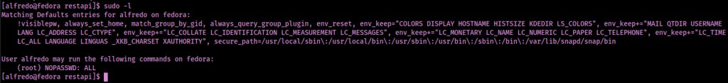After a minute, I checked sudo permissions again to ensure I now had “(root) NOPASSWD” permissions for everything.