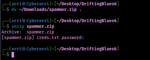 This revealed that it was password protected. I converted this file into a file that john would be able to work with with the command zip2john spammer.zip > zip.crack. I then cracked the password on the file using john --wordlist=/opt/Tools/rockyou.txt zip.crack.