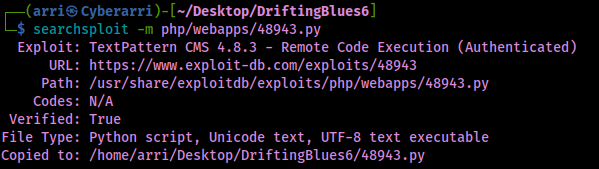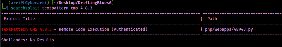 The website showed in the bottom left that it was “Textpattern CMS 4.8.3”. I searched this using searchsploit textpattern cms 4.8.3 to see if there are any exploits and there were!