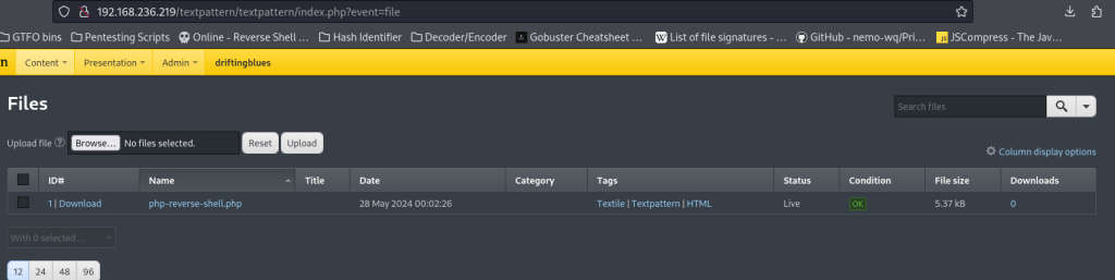 I tried to get this script to work, however it just did not. So, I went about exploiting manually using these same steps. I copied my php-reverse-shell to my local directory (Pentest Monkey Reverse Shell), and edited the file to have my current IP and my listening port. Once I completed this, I went to “/textpattern/textpattern/index.php?event=file” and uploaded the file.