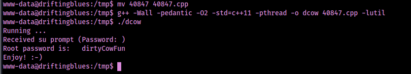 There was a dirtycow exploit that was listed. I downloaded the file on my local machine and transferred it over. I also went to the ExploitDB page on this to see the syntax on how I would compile it.