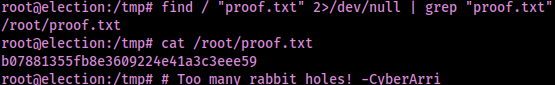 Now that I had executable permission on the file, I ran it using ./PwnKit. From here, I found the proof.txt flag location using the command find / "proof.txt" 2>/dev/null | grep "proof.txt" and then read it.
