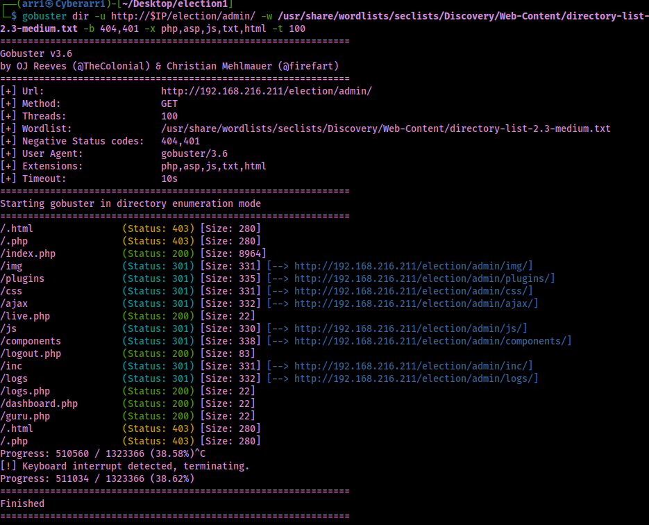 From here, I further gobustered (this time on “/election/”) using the command gobuster dir -u http://$IP/election/ -w /usr/share/wordlists/seclists/Discovery/Web-Content/directory-list-2.3-medium.txt -b 404,401 -x php,asp,js,txt,html.