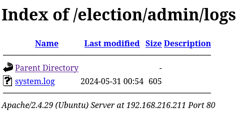 This shows that there is a directory at “/election/admin/logs” and I went there and there was a file named “system.log”.