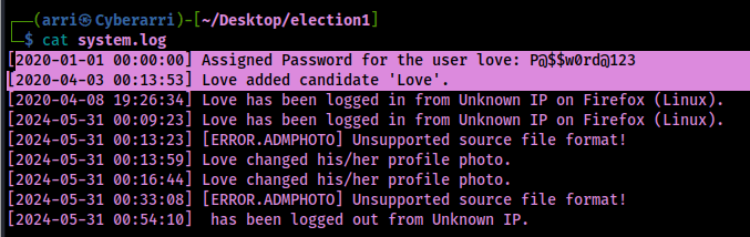 I downloaded this file using wget http://$IP/election/admin/logs/system.log. Once this was downloaded, I viewed the file this revealed the user “Love” and password “P@$$w0rd@123”.
