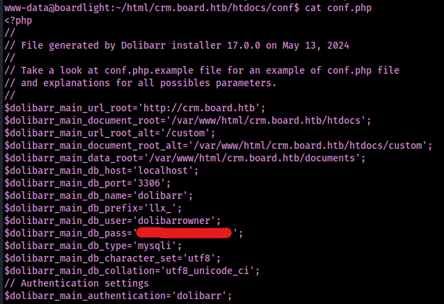 After digging around through the file system, I found the configuration files located at “/var/www/html/crm.board.htb/htdocs/conf” and noticed that there were several “conf” files, which could contain sensitive data.