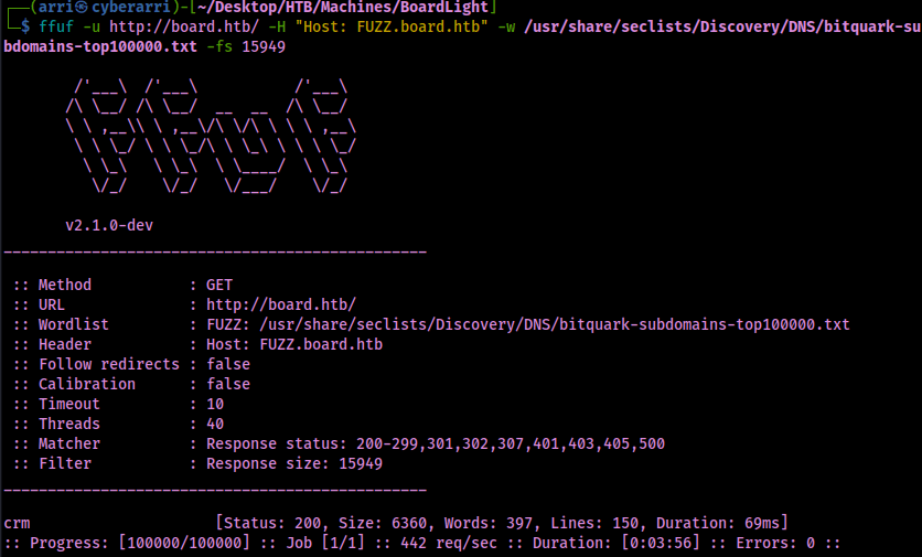 I then fuzzed for subdomains to see if there would be anything that came up. The command I used was as follows – “ffuf -u http://board.htb/ -H "Host: FUZZ.board.htb" -w /usr/share/seclists/Discovery/DNS/bitquark-subdomains-top100000.txt -fs 15949“. This specified the url (“-u”), specified the host header with where the location was to fuzz (“-H”), specified the wordlist to use (“-w”), and ignored anything with a file size of 15949.